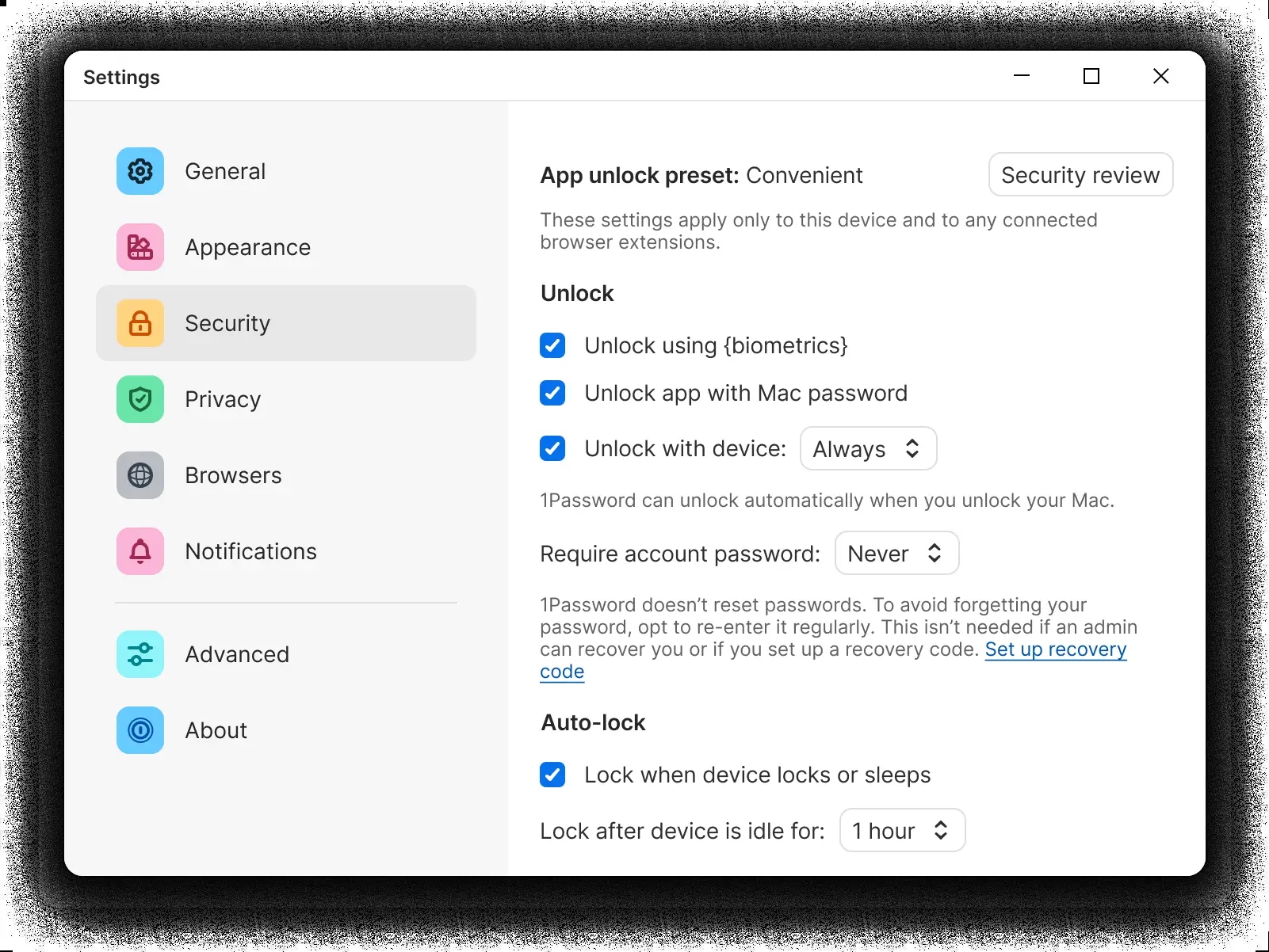 Kullanıcılar artık şifre kasalarına erişmek için ana parolalarını yazmak zorunda kalmayacak. Yeni güncellemeyle birlikte, kilit açma deneyimi kullanıcılara şu üç ayardan birini seçme olanağı sunuyor. Convenient, Mac kilitlendiğinde veya kilidi açıldığında 1Password uygulamasının da kilitlenmesini ya da açılmasını sağlıyor. Balanced seçeneğinde Mac ile birlikte 1Password’ün de kilidinin açılabilmesi için her 8 saatte bir uygulamaya giriş yapma zorunluluğu getiriyor. Strict seçeneği ise, 1Password kullanılmadığında kilitleniyor, uygulamanın kilidinin açılması gerekiyor.