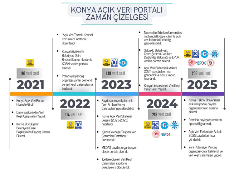 Bugün itibarıyla Konya Açık Veri Portalı, 20 paydaş kurum ve 230’un üzerinde veri seti ile hizmet veriyor. Çevre, Şehircilik ve İklim Değişikliği Bakanlığı, Konya Büyükşehir Belediyesi daire başkanlıkları, KOSKİ, Selçuklu Belediyesi, MEDAŞ, EPDK ve Konya Teknik Üniversitesi’nin ekosisteme dahil olmasıyla birlikte portalın kurumsal yapısı daha da güçlendi.
