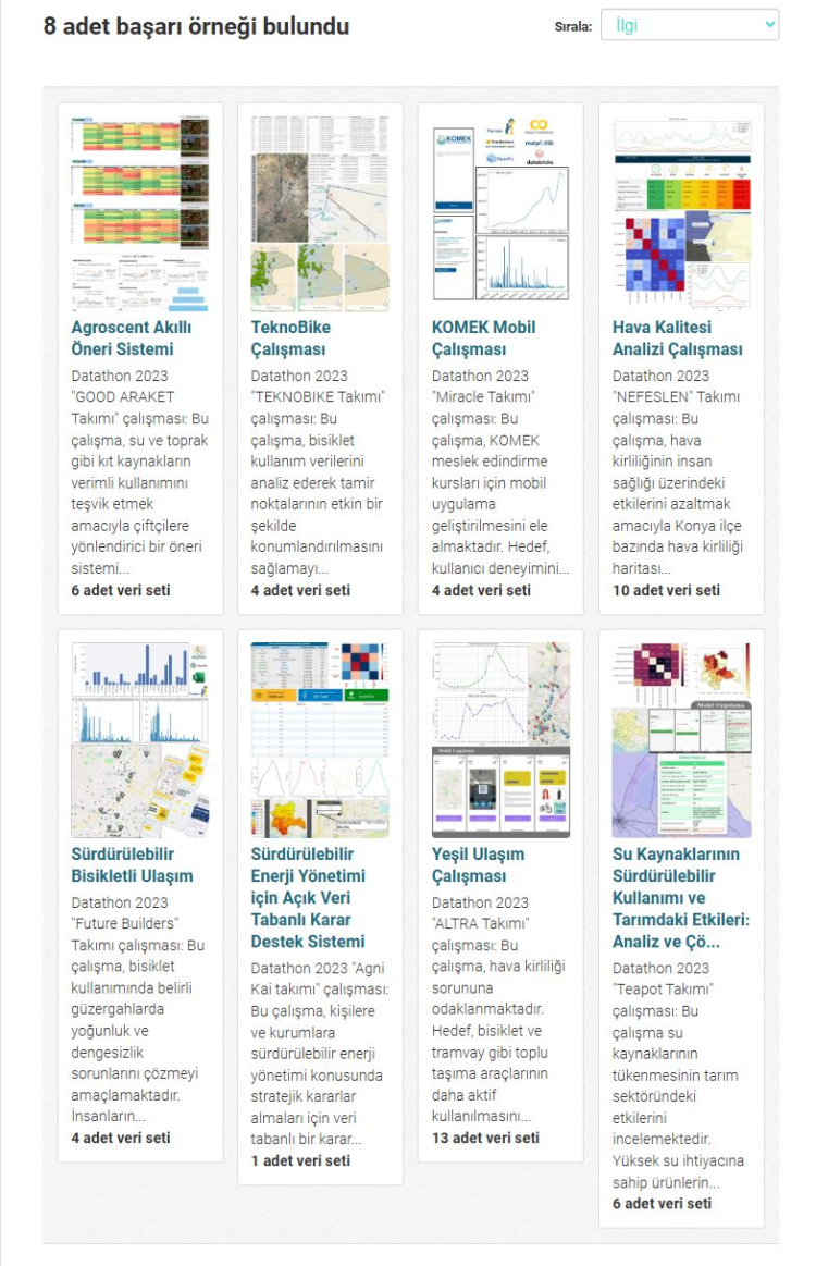 Açık veri tabanlı inovasyonu teşvik etmek amacıyla düzenlenen Datathon yarışmaları, yaratıcı proje fikirlerinin ve veri analizlerinin ortaya çıkmasına olanak tanıyor. Bu çalışmalar, portalda “Başarılı Örnekler” başlığı altında paylaşılarak açık verinin somut faydalarının daha geniş kitlelere ulaşmasını sağlıyor.