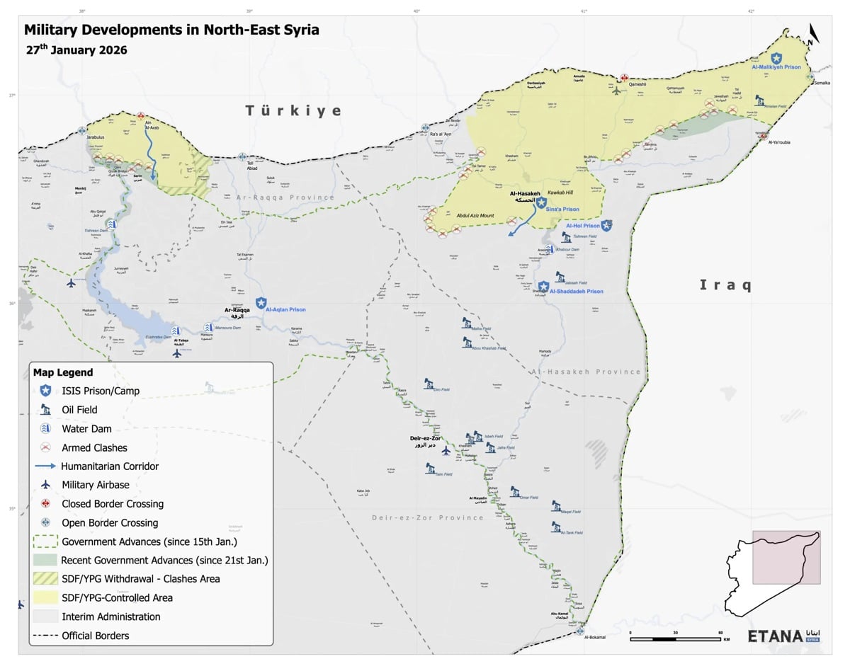 Rakka’daki El-Aktan cezaevindeki çok sayıda SDG mensubu, 23 Ocak’tan itibaren tesisten ayrılarak Kobanî’ye geçti ve cezaevinin kontrolünü devretti. Şu anda cezaevi tamamen geçici askerî polisin yetkisi altında. Suriye devlet televizyonu, SDG tarafından alıkonulan 126 çocuğun serbest bırakıldığını bildirirken, bir çocuk, cezaevindeyken elektrikle işkence gördüklerini ifade etti. Bu görüntüler hafta sonu sosyal medya platformlarında geniş yankı buldu. Hükümete yakın Suriyeliler ise bu olayı SDG’nin meşruiyetinin olmaması olarak değerlendirdi. Diğer tutukluların dosyaları şu anda Suriye Başsavcısı Hasan el-Turba ile Rakka Başsavcısı tarafından incelenmektedir.