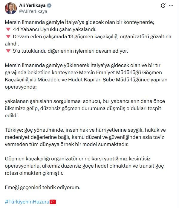 İçişleri Bakanı Ali Yerlikaya‘nın sosyal medya platformu X hesabından yaptığı açıklamada “Türkiye; göç yönetiminde, insan hak ve hürriyetlerine saygılı, hukuk ve medeniyet değerlerine bağlı, kamu düzeni ve güvenliğinden asla taviz vermeden tüm dünyaya örnek bir model sunmaktadır. Göçmen kaçakçılığı organizatörlerine karşı yaptığımız kesintisiz operasyonlarla, ülkemiz düzensiz göçe hedef olmaktan ve transit göç rotası olmaktan çıkmıştır. Emeği geçenleri tebrik ediyorum” ifadelerini kullandı.