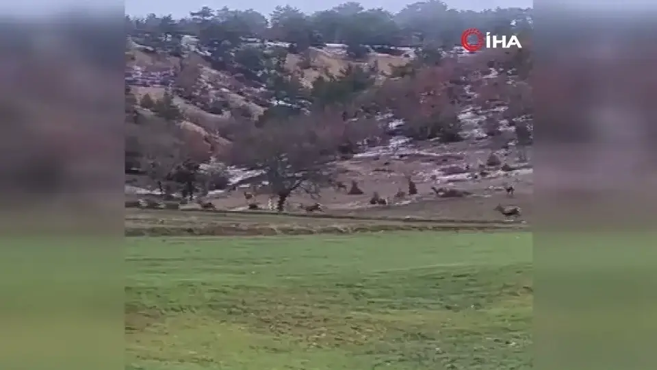 Ankara’nın Beypazarı ilçesinde aç kalan yaklaşık 100 yaban geyiği, yiyecek arayışıyla doğal yaşam alanlarını terk ederek Beypazarı–Nallıhan Karayolu’na indi.