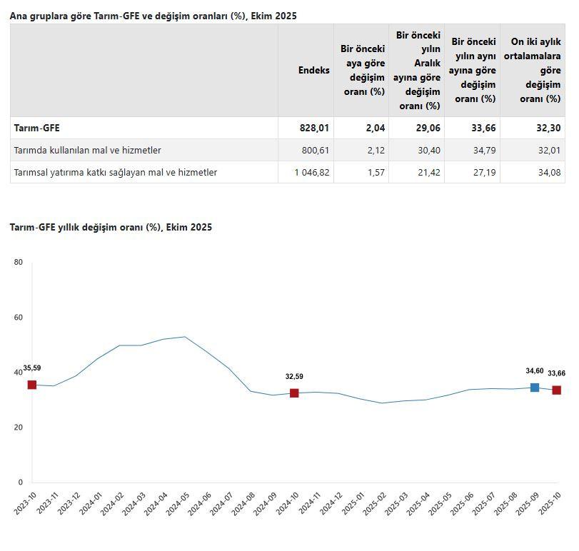 Buna göre, Tarım-GFE’de Ekim ayında bir önceki aya göre yüzde 2,04 artış, bir önceki yılın Aralık ayına göre yüzde 29,06 artış, bir önceki yılın aynı ayına göre yüzde 33,66 artış ve on iki aylık ortalamalara göre yüzde 32,30 artış gerçekleşti.