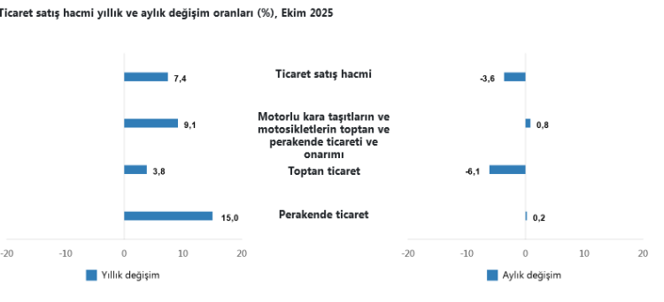 Alt sektörlerde yıllık değişim; motorlu kara taşıtları ve motosikletlerin toptan ve perakende ticareti ile onarımı yüzde 9,1 artış, toptan ticaret satış hacmi yüzde 3,8 artış, perakende ticaret satış hacmi yüzde 15,0 artış, aylık bazda ise ticaret satış hacmi yüzde 3,6 azaldı, ancak perakende satış hacmi yüzde 0,2 artış gösterdi.