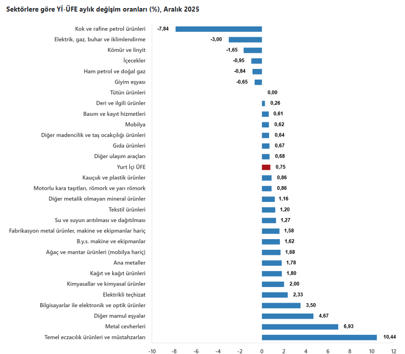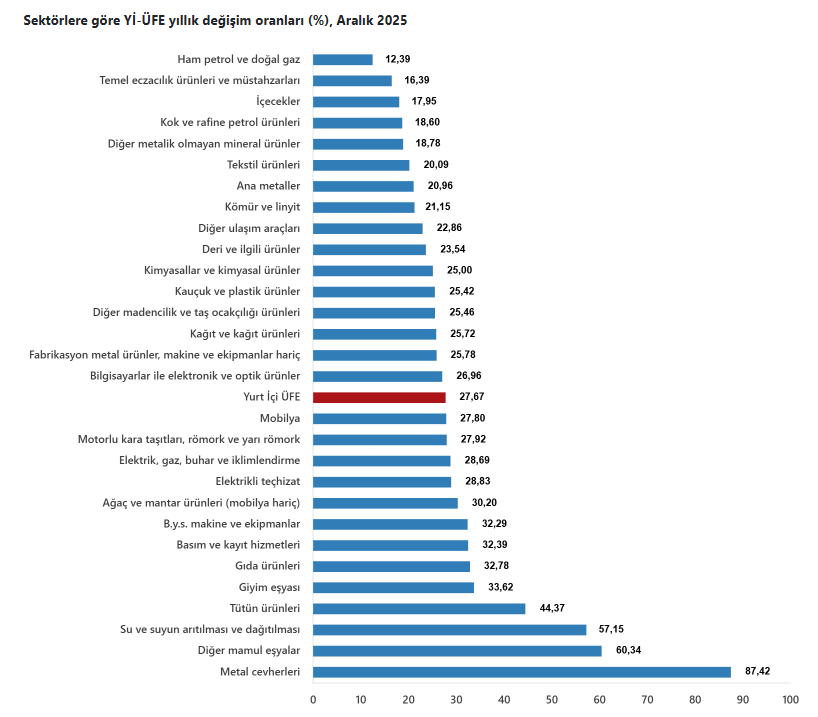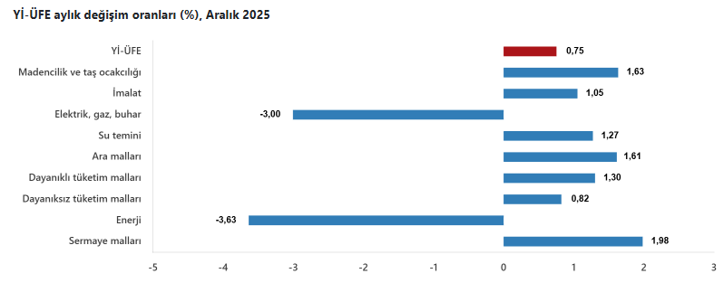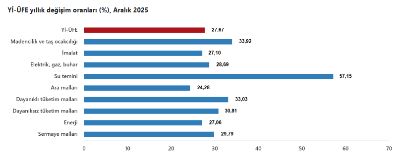 2025 yılı Aralık ayında Yİ-ÜFE (2003=100) verilerine göre, bir önceki aya göre %0,75 artış, bir önceki yılın Aralık ayına göre %27,67 artış, bir önceki yılın aynı ayına göre %27,67 artış ve on iki aylık ortalamalara göre %25,36 artış gözlendi.